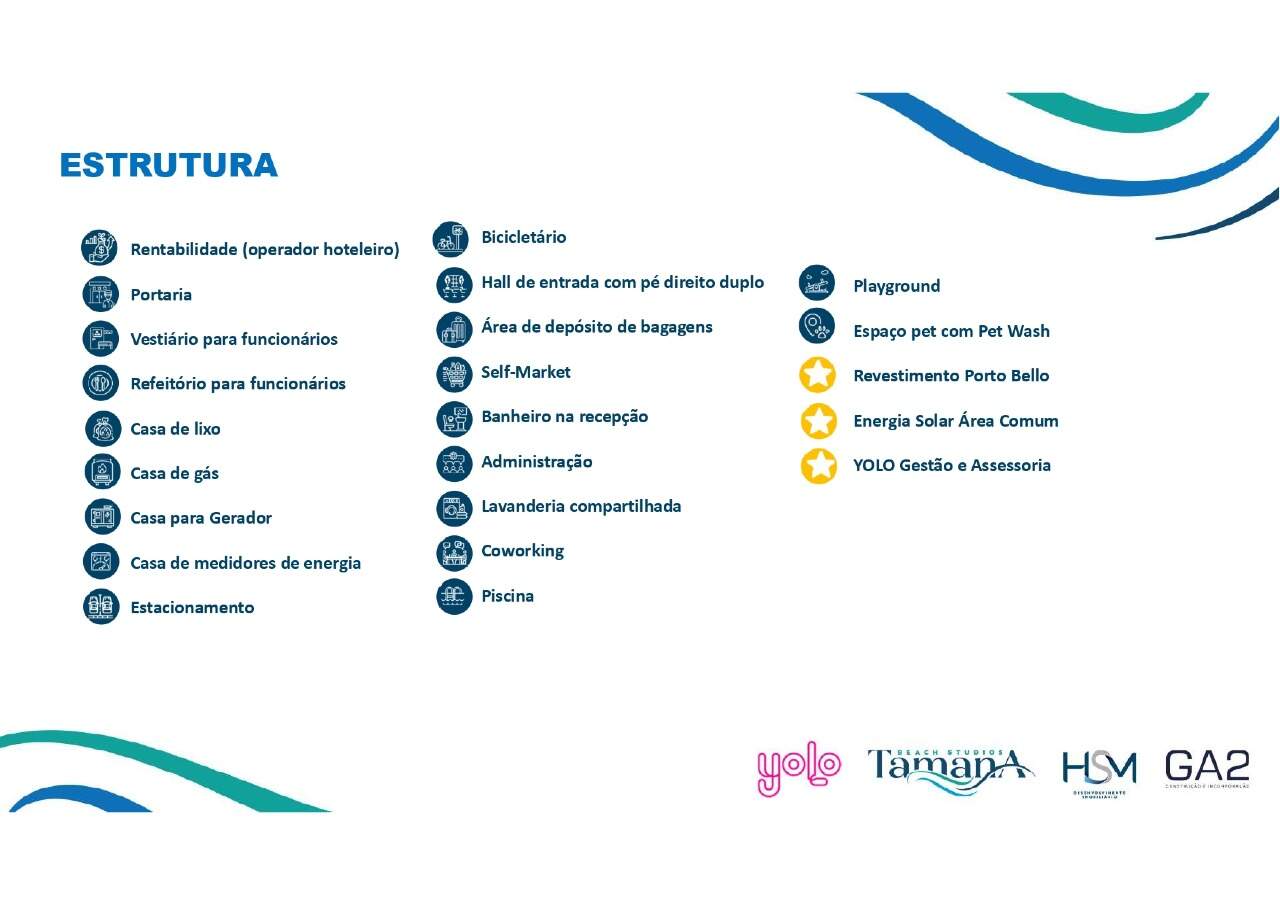 Além de recepção, restaurante, 2 elevadores, lavanderia, self market e bicicletário.